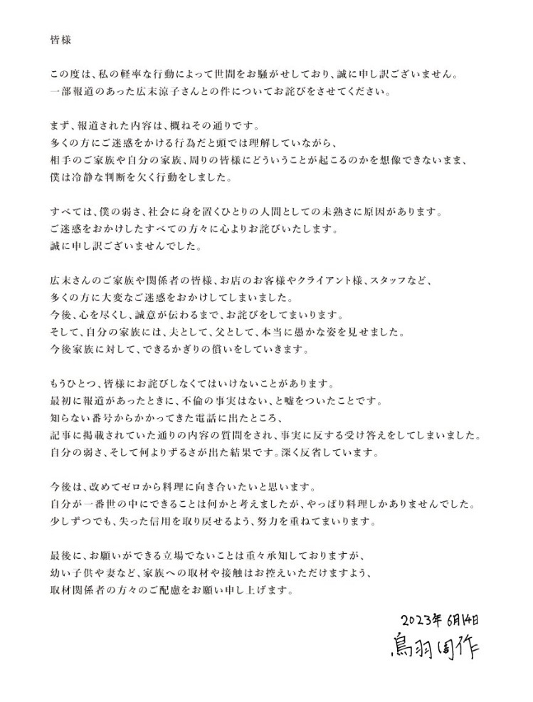 不倫を全面的に認め、2人同時に謝罪文を発表、事実であることを公表したのは6月14日のこと。
